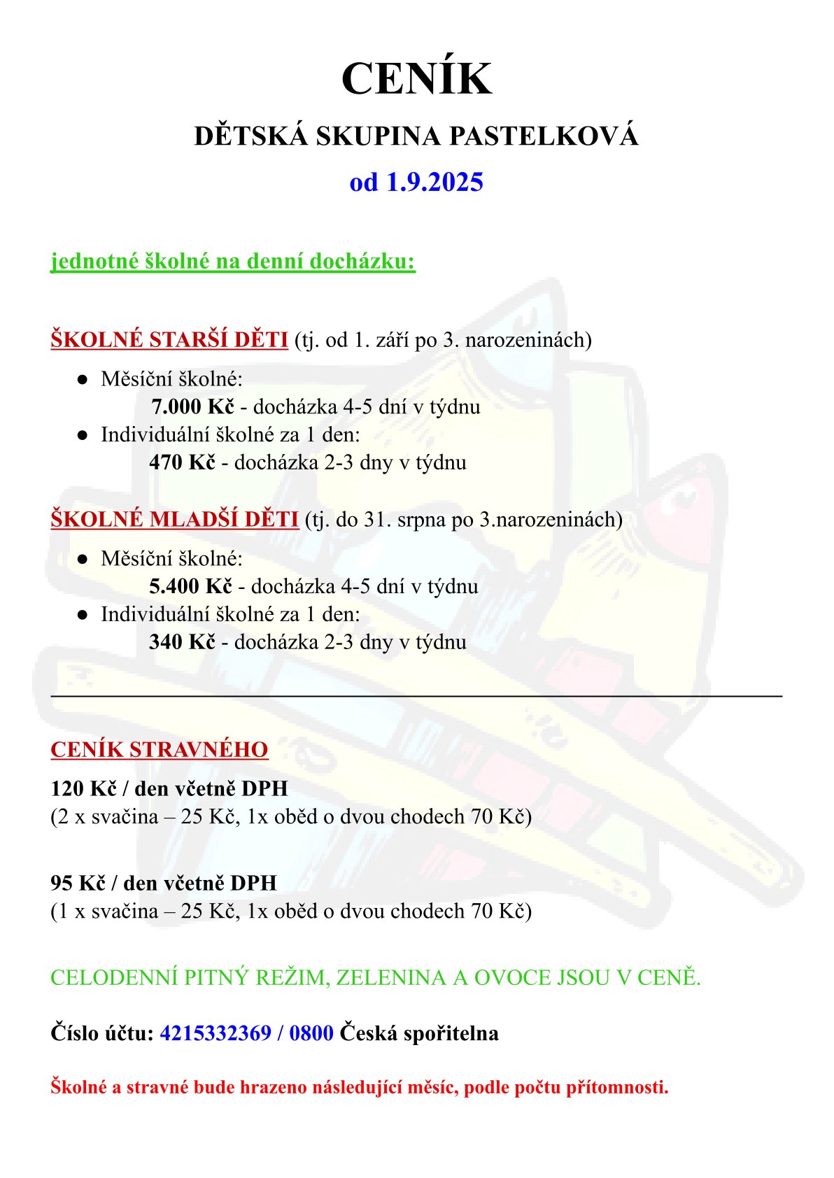 Ceníky jednotlivých Dětských skupin se může lišit v návaznosti na druhu dotačního programu, kterým je DS podporována.