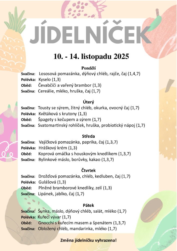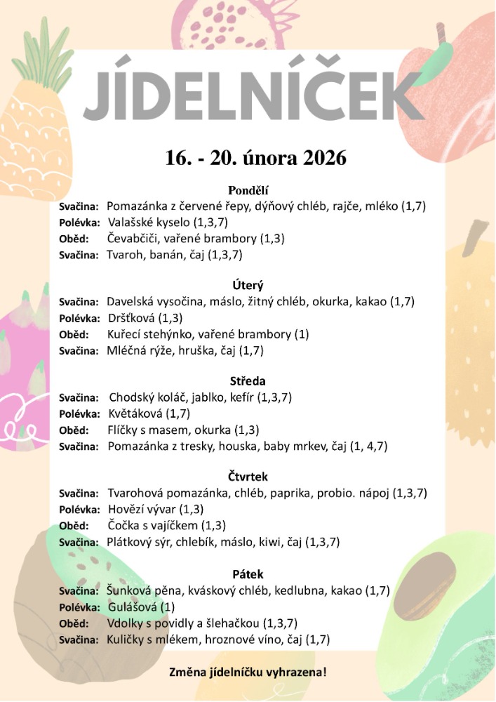 Záleží nám na tom, jak se Vaše děti stravují. Proto zajišťujeme dovoz vysoce kvalitního jídla z Farmářského bistra U Lidušky a ve Šťáhlavech z vyhlášené rodinné restaurace Pikolka . Jídlo je připravováno vždy čerstvé z regionálních potravin a je určeno přímo pro dětské strávníky. Seznam alergenů naleznete zde.